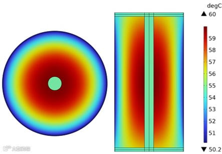 图2. 充电末期4695-280Wh/kg大圆柱电池径向方向的温度场模拟。