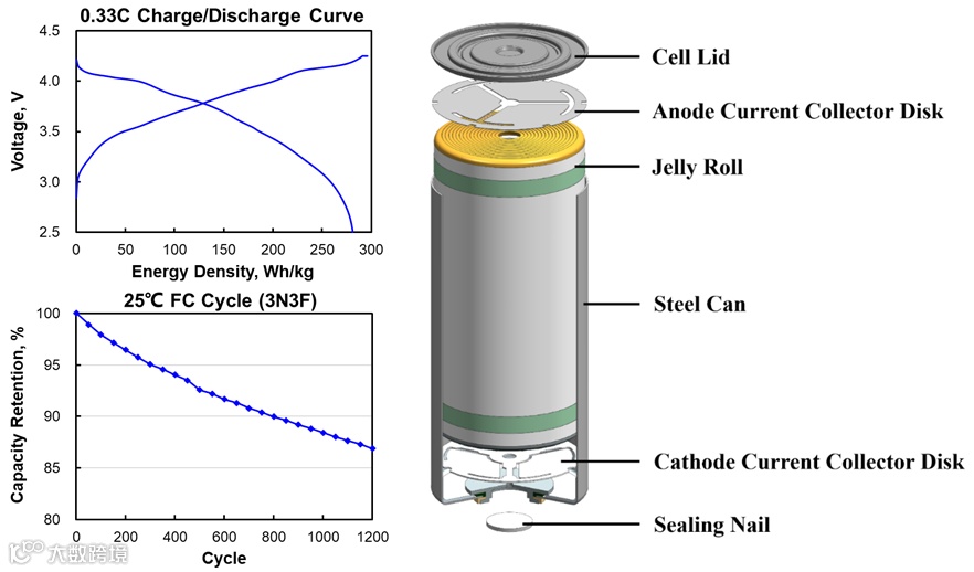 图1. 力神自主研发的4695-280Wh/kg大圆柱电池的基础电性能及结构示意图。