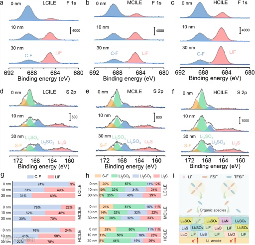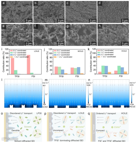 随着LiFSI浓度的增加,越利于富LiF的SEI形成。深度XPS显示HCILE具有内层富LiF的分布。这种由双阴离子FSI 和TFSI 衍生的坚固SEI层具有三维梯度分布结构,包含LiF、Li2S、Li2SO4、Li2SO3、Li2O、Li3N等无机组分和有机物种。这种高质量的SEI层能够有效应对循环过程中严重的体积膨胀和EMIM+阳离子的分解。赋予HCILE优异的Li枝晶抑制能力,克服了TFSI基IL电解质与Li金属的兼容性挑战。