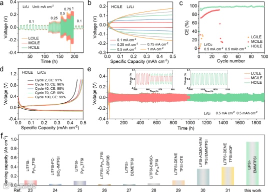 使用双阴离子(FSI-和TFSI-)策略协同构建坚固的SEI,克服了TFSI基IL电解质不稳定的锂沉积。作为结果, 离子液体电解质(HCILE)组装的Li//Li电池以0.5 mA cm−2/0.5 mAh cm−2能够稳定循环1900 h。此外, HCILE保留了TFSI基ILs的固有特性,具有5.4 V的极高氧化电位和250 °C的高温耐受性。在高压条件下(2.5~4.95 V), Li//LiFePO4电池也表现出可逆的阴极电化学特性。