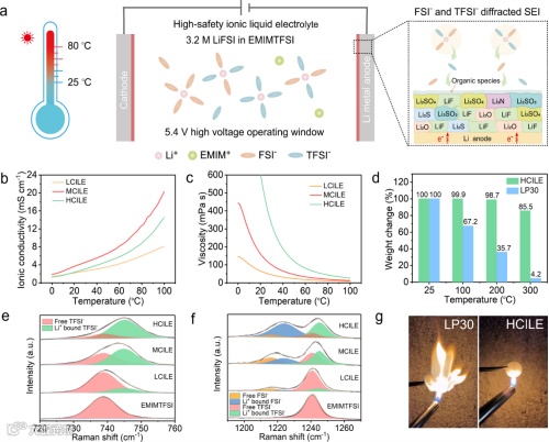 咪唑类阳离子由于咪唑环上的电荷离域特性减弱了与阴离子的相互作用。因此,EMIMTFSI表现出比其它IL更高的离子电导率。离子液体的物理化学特性对温度敏感,随着温度的升高,IL电解液的离子电导率显著升高,粘度显著降低,展现出高温应用的潜在优势。此外,相比于商用电解液LP30,HCILE具有优异的热稳定性,在200℃以内几乎没有质量损失。燃烧性测试显示LP30是高度可燃的,而HCILE是不可燃的,说明使用HCILE的LMB 具有更高的安全性能。拉曼光谱数据显示随着LiFSI的增加,电解液中自由阴离子FSI和TFSI的强度降低,更多的阴离子与Li离子形成了配位,促进了富LiF的 SEI层形成。