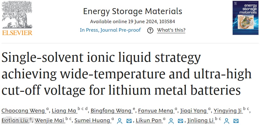Chaocang Weng, Liang Ma, Bingfang Wang, Fanyue Meng, Jiaqi Yang, Yingying Ji, Botian Liu, Wenjie Mai, Sumei Huang, Likun Pan, Jinliang Li, Single-solvent ionic liquid strategy achieving wide-temperature and ultra-high cut-off voltage for lithium metal batteries