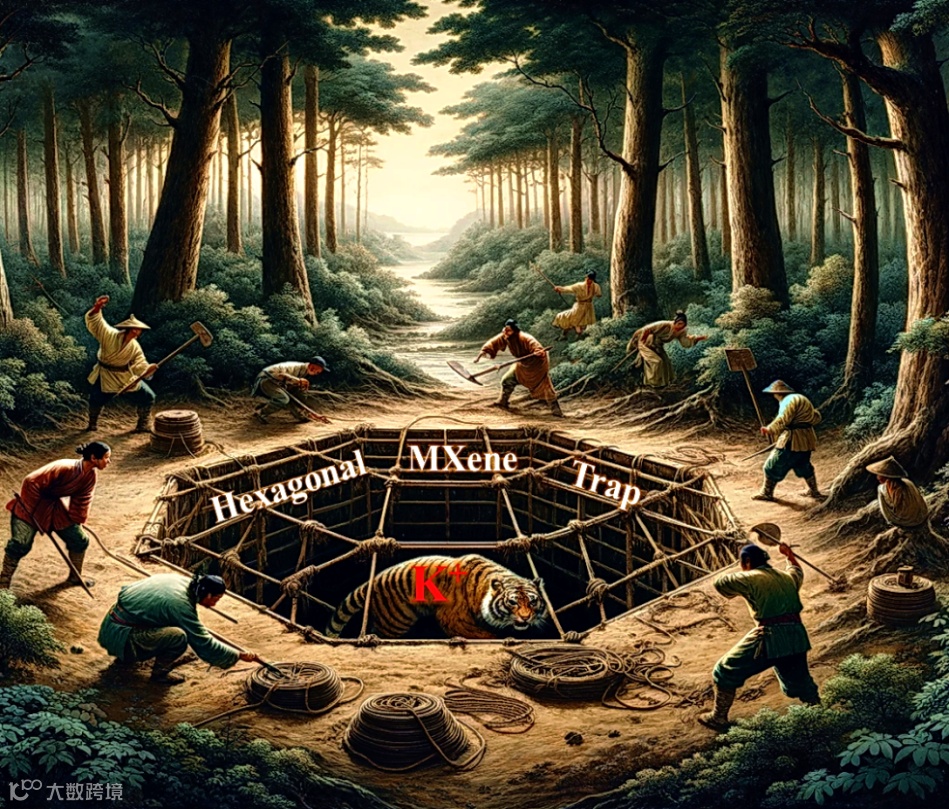 图1. 通过六方孔洞MXene陷阱捕获钾离子示意图,灵感来自古代深挖多层陷阱捕捉猛兽的故事。