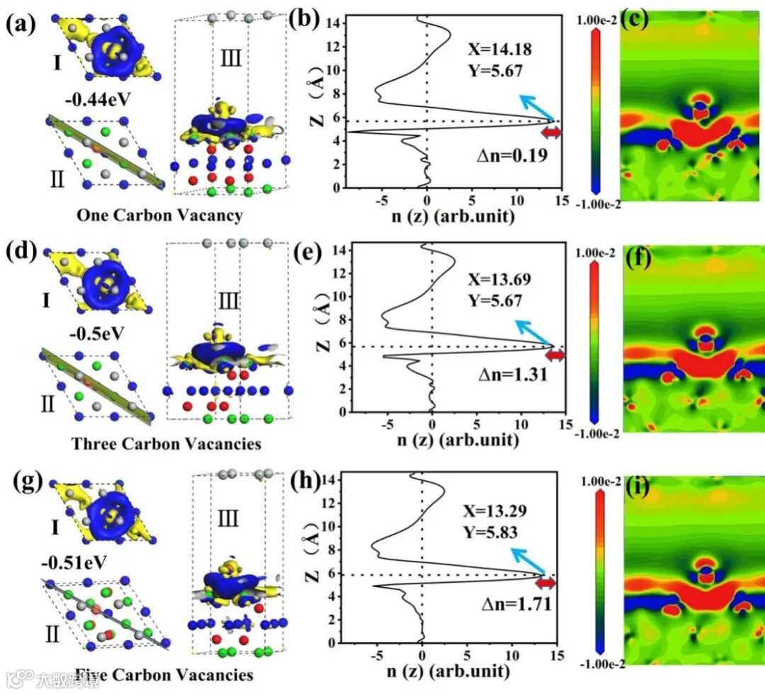 要点三:揭示碳空位对多层六方孔洞MXene的钾离子吸附和电子传输的影响机制