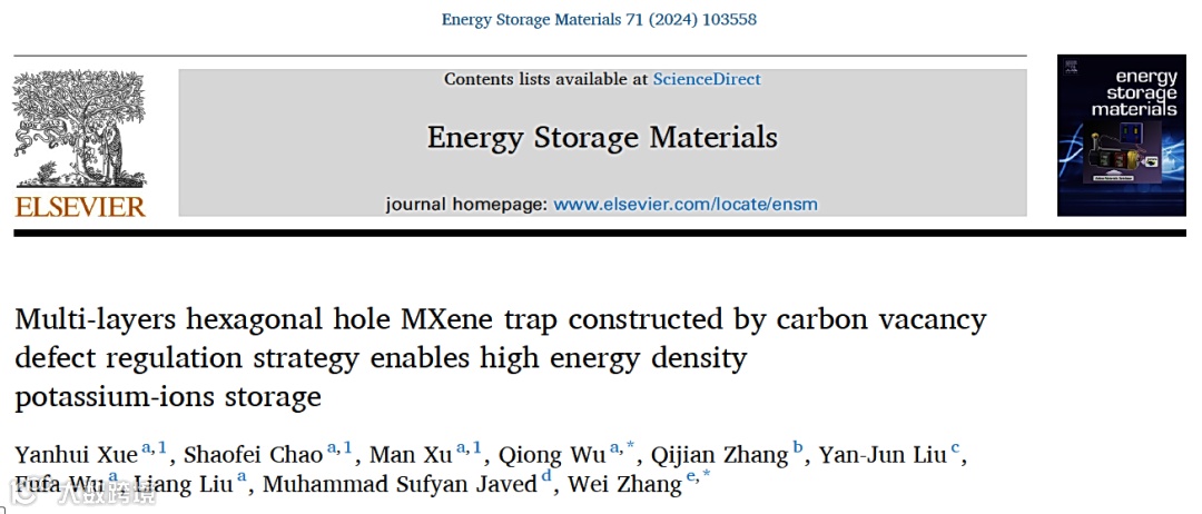 近日,来自辽宁工业大学的吴琼教授和吉林大学的张伟教授,在国际知名期刊“Energy Storage Materials”上发表题为“Multi-layers hexagonal hole MXene trap constructed by carbon vacancy defect regulation strategy enables high energy density potassium-ions storage”的研究文章。