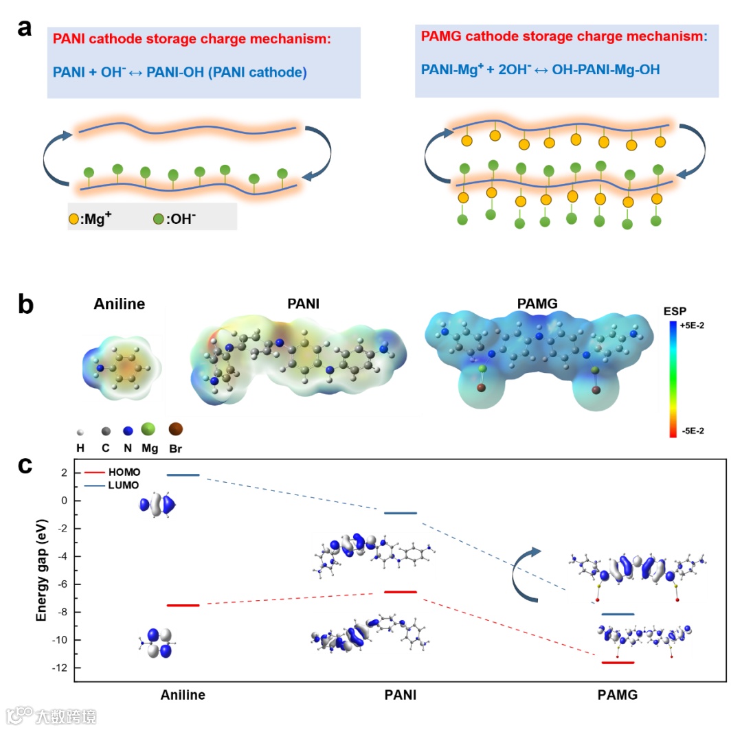 通过理论计算分析,结构优化后的Aniline, PANI和PAMG分子形成高度共轭体系,苯环上的π电子和胺基氮上的p电子之间存在扩展共轭作用,因此电子可在整个分子中离域。为了分析电子云分布,我们对分子静电势(ESP)进行了理论计算(图6a)。结果表明,相比Aniline和PANI,掺杂后的PAMG材料的形成几乎完全对称电子云分布。这种对称排列阻止了电子云的移动,整个分子的电负性降低,将会有更高的放电电压。同时,PAMG材料的HOMO与LOMO的能级差(ΔE=3.45 eV)更小,表明PAMG材料的电子导电能力优于PANI(图6b)。这也证明了镁离子能够调控局部电子云密度,增大苯环的π电子共轭,可有效提升材料的电子导电能力。