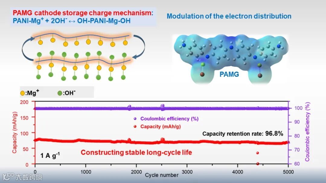 本文试图构建新型的可充电碱性锌镁电池(PAMG),通过利用PANI的电中性掺杂机制实现对氢氧根阴离子的吸附,而不是形成难溶的氢氧化镁从而保证进一步的存储电荷反应。得益于这样的设计,在电流密度为1.0 A g-1下,PAMG经过5000次循环后仍具有96.8%的剩余容量(73.2-70.9 mAh g-1),库伦效率始终保持在99.8%以上。理论计算和实验均表明掺杂后改善了导电性和和放电平台。这项工作能期盼够推动锌电池和其他高性能储能系统的进一步发展。