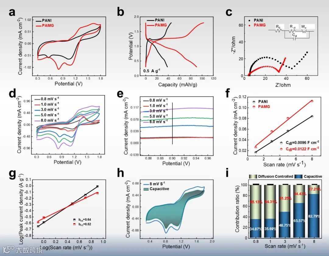 为了验证PAMG材料的结构稳定性,我们进行了电化学测试并进行动力学分析。图4a是在电压窗口为0.3-1.8 V处不同扫描速率的CV曲线。扫描速率从0.8 mV s-1增至8 mV s-1过程中, CV曲线形状没有明显变化,表明其良好的倍率能力。图4c显示了在扫描速率为8 mV s-1时的CV曲线,其表面电容高达82.79%。图4d清楚地表明,随着扫描速率的增加,表面电容贡献逐渐升高(34.87%-82.79%),这表明PAMG电池的电化学过程主要是由表面电容控制起主导作用并具有较快的反应动力学。