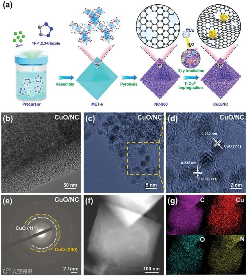 以γ射线辐解水溶液产生的活性物种将铜离子转化为氧化铜(CuO)纳米颗粒并均匀负载在MET-6 MOF衍生的氮掺杂多孔碳(NC)上, 制备得到CuO/NC催化剂。由于γ射线的强穿透性,化学反应可以在溶液中均匀发生,有利于制备超小尺寸的CuO纳米粒子。