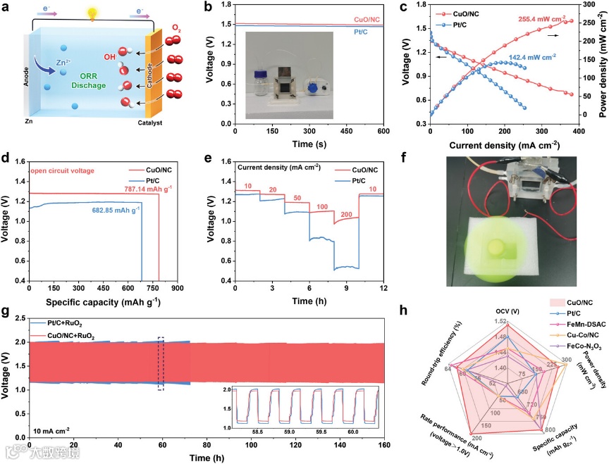 CuO/NC催化剂在碱性电解质中表现出高ORR活性,由其组装得到的锌空气电池具有超高峰值功率密度、大质量比容量和良好的循环稳定性。