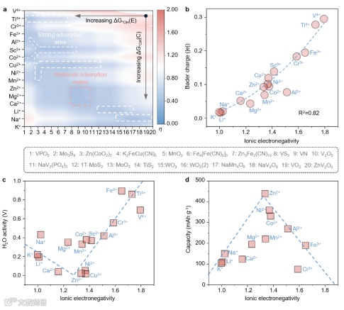 通过密度泛函理论(DFT)计算,发现固体电极和溶剂化的金属阳离子对于水裂解活性的影响可以分别通过它们的d带中心和离子电负性进行量化,从而筛选出最佳的金属离子-正极材料组合,表明Zn²⁺-VN能表现出最优异的水解活性。