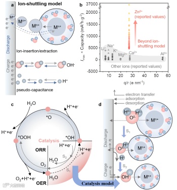 然而,研究人员开发了多种高倍率AZIBs,其性能超越了其他单价和多价水系金属离子电池。AZIBs的这种优越性能超出了传统离子穿梭理论的预测,提示可能存在未被发现的电荷储存机制。虽然研究人员常将AZIBs的高倍率性能归因于H+/H2O/OH-的嵌入/赝电容,但这些物质本身并不独特,其他水系金属离子电池中也存在。因此,Zn²⁺在提升H+/H2O/OH-的贡献中可能起到了特殊作用。H+/H2O/OH-也是电催化研究中的关键物种,且电催化中的反应速率远超电池中的反应速率。鉴于*OH吸附行为在析氧反应(OER)、氧还原反应(ORR)及AZIBs中具有共性,基于水裂解及*OH吸脱附的电荷存储可能解释AZIBs的高倍率性能。在Zn²⁺的帮助下,水裂解及*OH吸脱附的动力学显著加快,提供了不同于传统离子穿梭模型的快充机制。