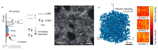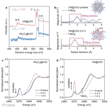 常规VN在水中和空气中极易氧化,从而打破模型预测的最佳VN-Zn²⁺平衡。采用前驱体尺寸筛选法(利用三维多孔还原氧化石墨烯气凝胶限域VN纳米簇),该工作成功合成了模型预测的纯VN(VN@rGO)。使用水系ZnSO4电解液时,VN-Zn²⁺组合主要通过水裂解生成的OH的可逆吸脱附有效完成了存储过程。