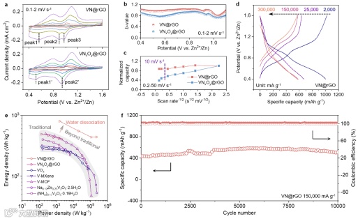 实验表明,VN@rGO在高电流密度下表现出优异的快充性能和稳定的循环性能——在300,000 mA g-1的高电流密度下容量达到577.1 mAh g-1,在150,000 mA g-1的高电流密度下稳定循环10000圈,验证了Zn²⁺介导催化模型的有效性。