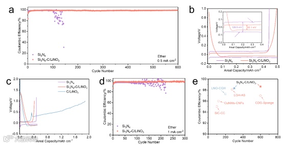 醚基电解液(1 M LiFSI-DME)中,Si3N4-LiNO3/C在Li || Cu电池中的库伦效率与循环性能实现了进一步提升。首次成膜循环后,双层宿主在0.5 mA cm-2的电流密度下能够稳定循环600圈,平均库伦效率高达98.65%,首次锂成核过电位低至9.8 mV。即使在1 mA cm-2下,Si3N4-LiNO3/C也能稳定循环300圈,平均库伦效率为98.38%。值得注意的是,Si3N4-LiNO3/C和Si3N4电极在Li || Cu电池中都能实现正常的放电与充电过程,而LiNO3/C电极在运行时出现异常。