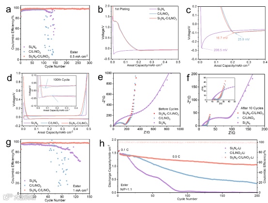 图4. Si3N4-LiNO3/C在碳酸酯电解液中的电化学性能分析