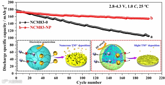 图1. 基于NCM83-0和NCM83-NP的电池的电化学性能对比及协同改性策略的作用机制