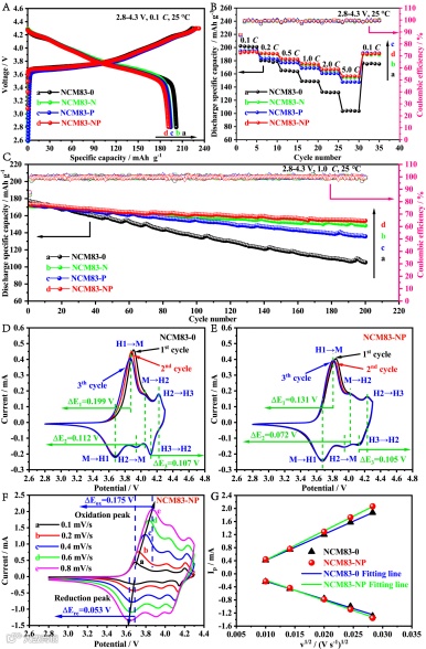 图3 基于NCM83-0、NCM83-N、NCM83-P和NCM83-NP的电池的首次充放电(A)、倍率(B)和循环(C)曲线;基于NCM83-0(D)和NCM83-NP(E)的电池的前3圈CV曲线;基于NCM83-NP的电池在不同扫描速率下的CV曲线(F);基于NCM83-0和NCM83-NP的电池的Ip和v1/2的拟合图(G)