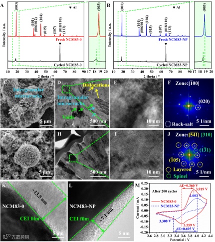 图4 NCM83-0(A)和NCM83-NP(B)循环前后的XRD对比图;NCM83-0(C-F)和NCM83-NP(G-J)循环后的FE-SEM、截面TEM、HR-TEM和相应的FFT图;NCM83-0和NCM83-NP循环后的TEM图(K,L)和CV曲线(M)