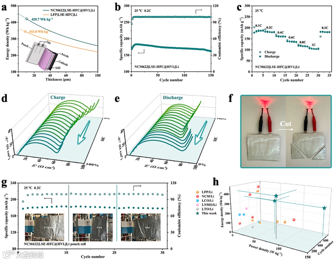 图6 a) 分别采用 LFP 正极和 NCM622 正极的 LSE-HFC 和 LSE-HFC@HVL 的重量能量密度与厚度的函数关系(插图显示了概念软包电池模型);b) NCM622|LSEHFC@HVL|Li 电池在 25 ℃ 和 0.2C 下的循环性能以及 c) 25 ℃ 下的速率性能;d) NCM622|LSE-HFC@HVL|Li 电池在 2.8-4.3 V 电压下充电过程和 e) 放电过程的原位 EIS;f) 切割测试后,NCM622|LSE-HFC@HVL|Li 软包电池点亮 LED 灯泡;g) 软包电池弯曲过程中的循环性能;h)循环寿命、能量密度、功率密度与其他文献的对比。