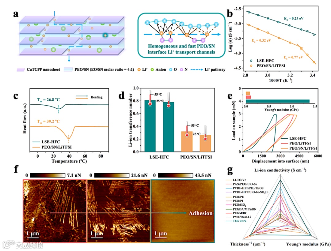 图3. a) LSE-HFC 中锂离子转移机制示意图;b) PEO/SN/LiTFSI 和 LSE-HFC 的离子电导率、c) DSC 曲线和 d) 锂离子迁移数;e) PEO/LiTFSI、PEO/SN/LiTFSI 和 LSE-HFC 的载荷-位移曲线和 (f) 用原子力显微镜绘制的粘附力图;(g)锂离子传导率、杨氏模量和厚度与文献中其他 SSE 的比较。