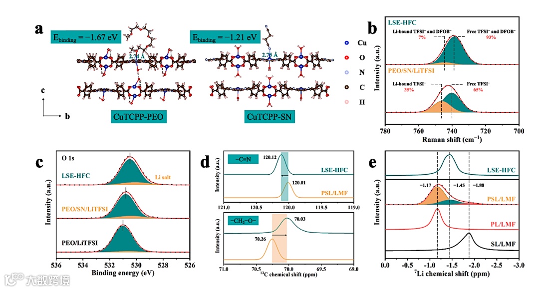 图2. a) CuTCPP与PEO 和 SN 的吸附结合能计算;b) PEO/SN/LiTFSI 和 LSE-HFC 的拉曼图谱;c) PEO/LiTFSI、PEO/SN/LiTFSI 和 LSE-HFC 的 O 1s XPS 图谱;d) LSE-HFC和PSL/LMF的13C NMR图谱;e) SL/LMF、PL/LMF、PSL/LMF 和 LSE-HFC 的 7Li 固态 MAS NMR 图谱。