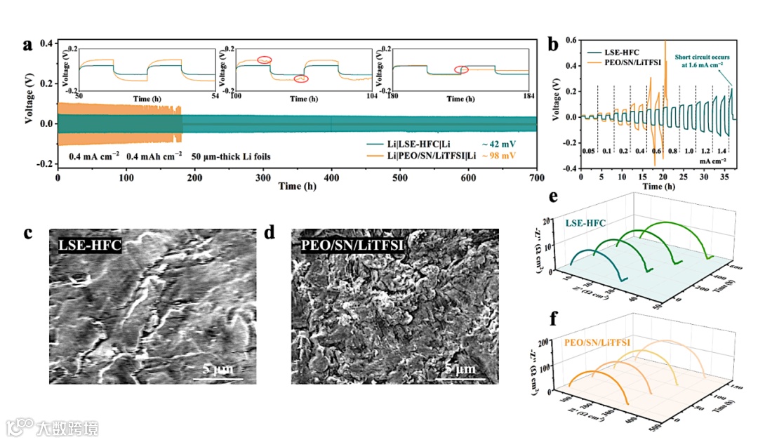 图4. a) 对称锂电池在 55 ℃、0.4 mA cm-2 和 0.4 mAh cm-2 下的长期循环(插图分别显示电池在 50、100 和 180 小时后的电压曲线);b) 锂对称电池的倍率性能测试,以确定临界电流密度;c) LSE-HFC 对称电池和 d) PEO/SN/LiTFSI 对称电池中Li沉积/剥离后的锂电极表面 SEM 图像;e) LSE-HFC 和 f) PEO/SN/LiTFSI 对称锂电池的原位 EIS 图。