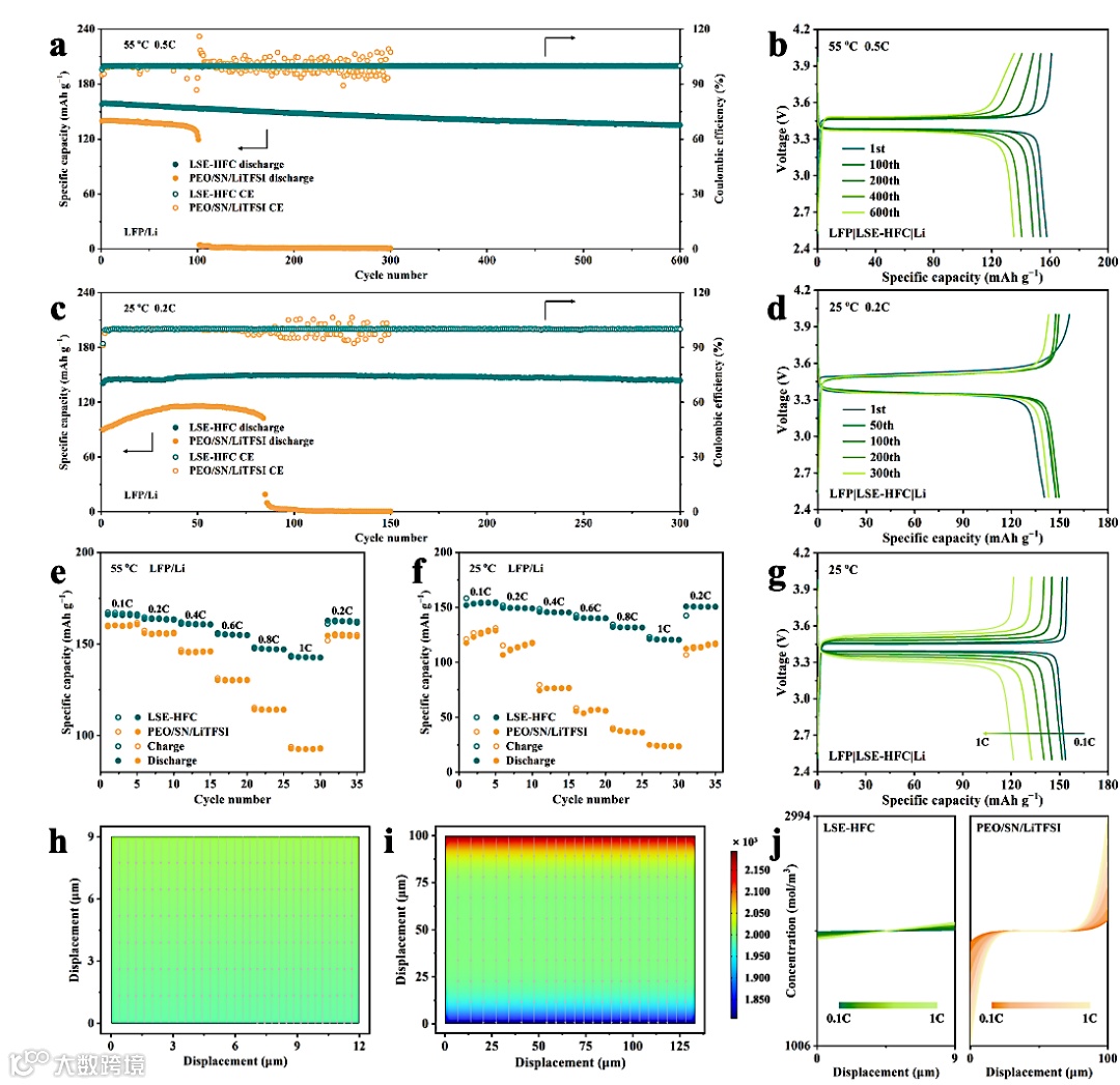 图5. a)和b) 55 ℃ 和 0.5C条件下使用不同电解质组装的电池的循环性能和相应的电压曲线;c)和d) 25 ℃ 和 0.2C条件下使用不同电解质组装的电池的循环性能和相应的电压曲线;e)-g) 磷酸铁锂电池的倍率性能;h)和i) LSE-HFC 和 PEO/SN/LiTFSI 中电流密度为 0.24 mA cm-2 时的锂离子分布模拟; j) LSE-HFC 和 PEO/SN/LiTFSI在不同电流密度下的锂离子浓度分布。