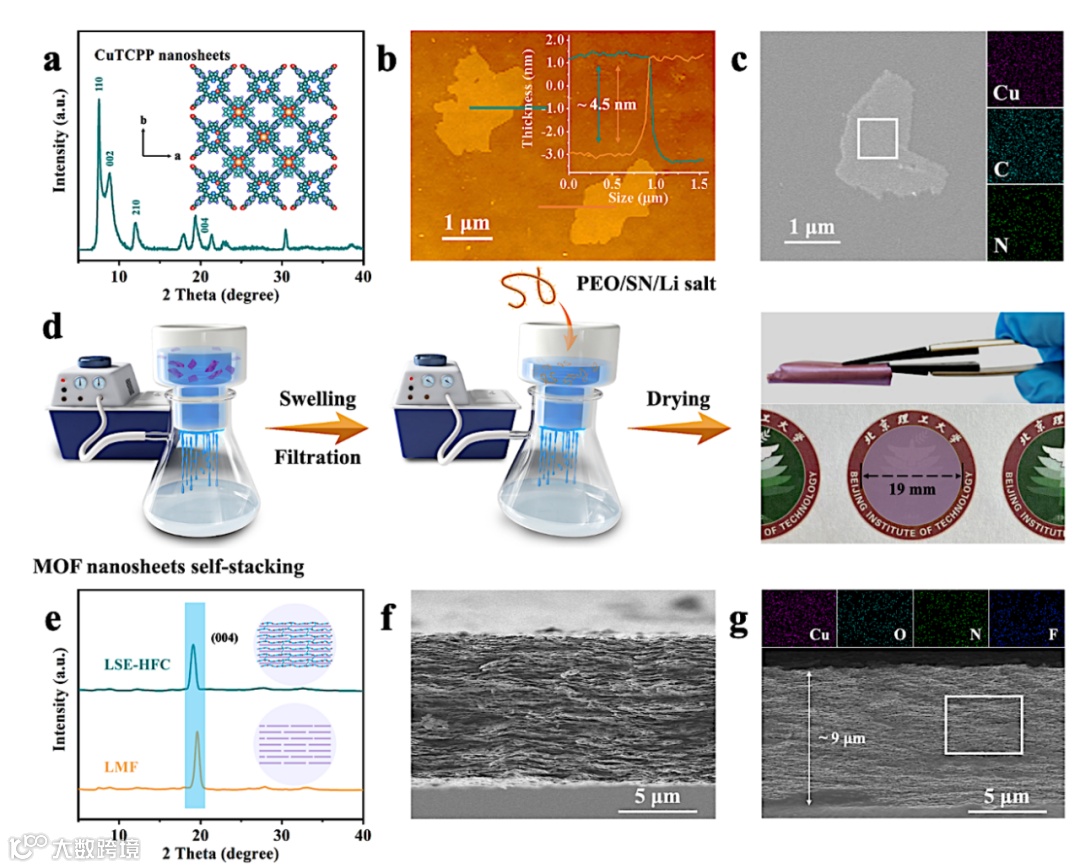 图 1. a) CuTCPP 纳米片的 XRD 图谱、b) AFM 图像和相应的高度分布图、c) SEM 图像和相应的元素(Cu、C和N)分布图;d) LSE-HFC的制备流程图;e) LMF和LSE-HFC的XRD图谱;f) LMF 和 g) LSE-HFC 的横截面 SEM 图像(插图显示了相应的元素(Cu、O、N 和 F)分布)。
