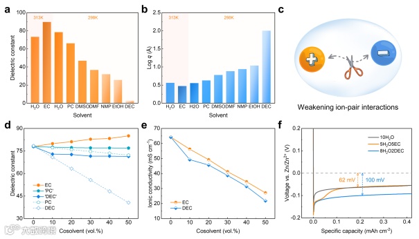 图1. 溶剂之间的差异。(a)不同溶剂的介电常数。(b)基于单价离子盐在不同溶剂中的临界离子对形成距离。(c)削弱离子对相互作用的示意图。(d)加入不同共溶剂后的水系溶剂的介电常数。虚线代表理论值。(e)2.0 M Zn(OTf)₂在不同共溶剂中的离子电导率。(f)在不同电解液中,锌在铜片上以1.0 mA cm⁻²电流密度沉积的电压曲线。