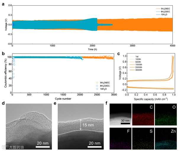 图5 电解液和锌负极的电化学性能。(a)在5.0 mA cm⁻²和1.0 mAh cm⁻²条件下,Zn/Zn电池的循环性能。(b)在5.0 mA cm⁻²和1.0 mAh cm⁻²条件下,Zn/Cu电池的循环性能。(c)在含有50体积% EC的水系电解液中,Zn/Cu电池的对应电压曲线。(d)在纯水系电解液中沉积的锌表面的HRTEM图像。(e)在含有50体积% EC的水系电解液中沉积的锌表面的HRTEM图像。(f)沉积锌表面的STEM图像和EDS元素分布图。