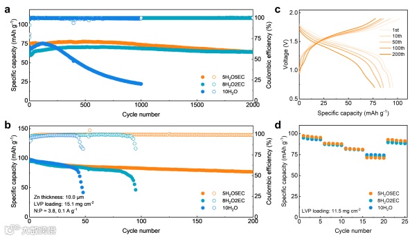 尽管引入EC不可避免地导致离子电导率降低,但采用具有动力学补偿机制的水系电解液的Zn/LVP全电池在较高充放电倍率下仍能保持与纯水系电解液极为接近的放电比容量。