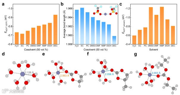 图2 组分间的相互作用。(a)在纯水溶剂或含有50体积%不同共溶剂的混合水系溶剂中,一个Zn²⁺与两个OTf⁻之间的结合能。(b)在纯水溶剂或含有50体积%不同共溶剂的混合水系溶剂中,一个Zn²⁺与两个OTf⁻配位氧原子之间的平均键长。(c)Zn²⁺与溶剂分子之间的结合能。(d-f)Zn²⁺与(d)EC、(e)PC和(f)DEC的配位氧原子之间的键长。在球棍模型中,原子的颜色为:氢,浅灰色;碳,深灰色;氧,红色;锌,蓝灰色。