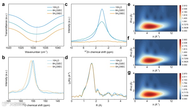 图4 EC对水系电解液的影响。(a)不同电解液的FTIR光谱。(b)不同电解液的¹⁷O NMR光谱。(c)不同电解液的⁶⁷Zn NMR光谱。(d)Zn K边的EXAFS光谱。(e-g)Zn K边的小波变换:(e)10H₂O,(f)8H₂O2EC和(g)5H₂O5EC。
