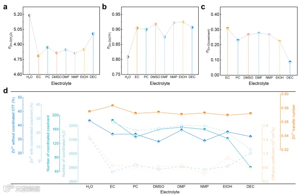 图3 溶剂化结构的差异。(a-c)Zn²⁺第一溶剂化壳层中相应分子/离子的配位数:(a)H₂O,(b)OTf⁻和(c)共溶剂。(d)根据MD结果,溶剂化环境与Zn²⁺动力学性质之间的关系图。坐标轴按梯度高度显示,每条轴对应相同颜色的折线图。