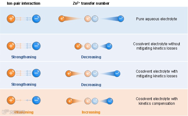 与单纯降低对电解液中Zn2+扩散系数的影响的传统策略不同,动力学补偿机制主要通过以下两个方面实现:(1)削弱Zn2+与阴离子之间的库仑相互作用;(2)提高Zn2+的迁移数。