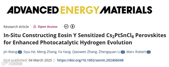 光催化分解水产氢(HER)是解决能源危机的关键技术,但传统铅基钙钛矿因毒性和稳定性问题难以实际应用。浙江师范大学王靳、李正全团队联合法国索邦大学Marc Robert教授,首次通过原位合成技术,将染料曙红Y(EY)锚定在无铅钙钛矿Cs2PtSnCl6表面,开发出高效稳定的EY-Cs2PtSnCl6光催化剂。该材料在可见光下产氢速率高达17.6 mmol g-1 h-1,较原始材料提升1760倍。这一成果为设计高效钙钛矿光催化剂开辟了新路径。