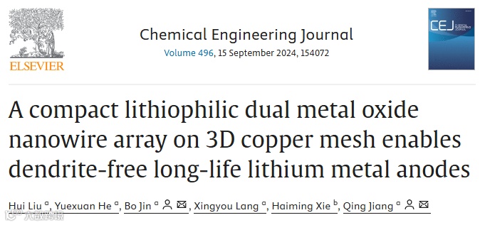3D铜网上致密的亲锂双金属氧化物纳米线阵列实现了无枝晶长寿命锂金属阳极