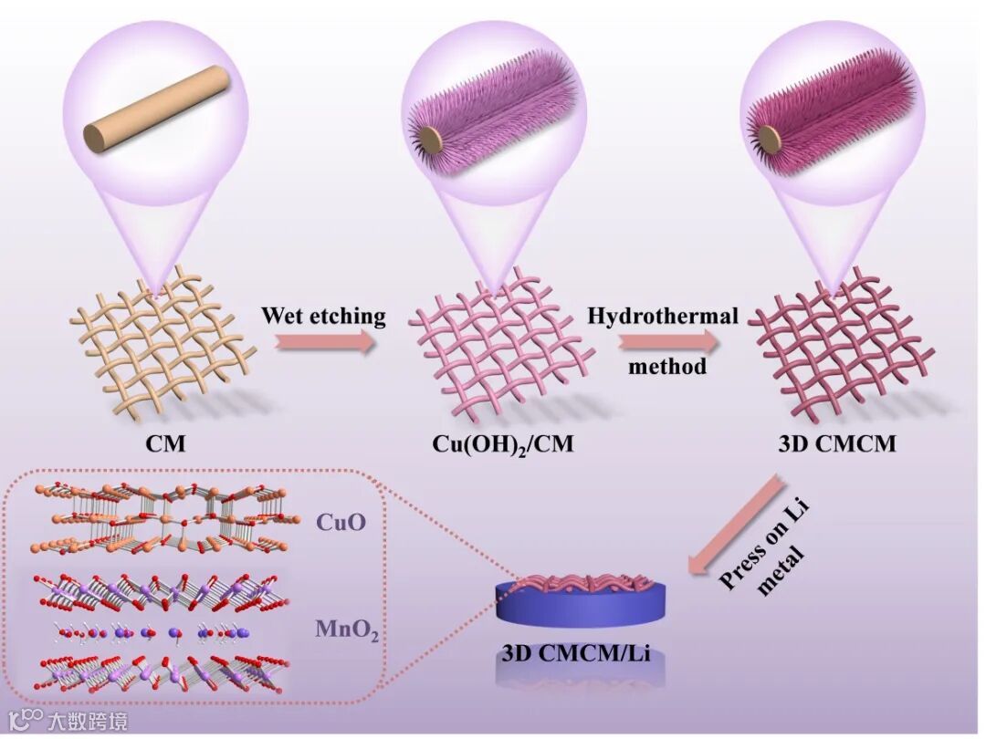 本研究使用湿法蚀刻和一步水热法设计了一种独特的3D CMCM骨架。通过简单地压制法将3D CMCM压入锂箔中,可以获得3D CMCM/Li复合阳极,从而省去了进一步预填充Li的需要。3D CMCM骨架完美地结合了CuO和MnO2的亲锂性优势,不仅降低了成核过电位,还促进了反应动力学。密度泛函理论(DFT)计算也证实了氧化物纳米线阵列的亲锂本质。同时,3D骨架有助于降低局部电流密度,提高锂镀/剥离的可逆性,从而保证了长寿命的锂金属阳极。