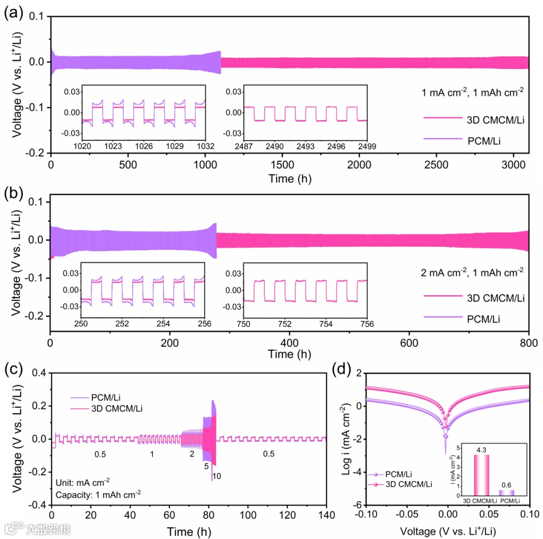 图2. 具有3D CMCM/Li和PCM/Li的对称电池的电化学性能。