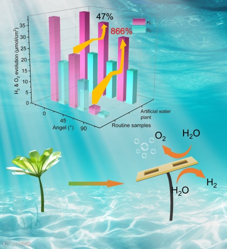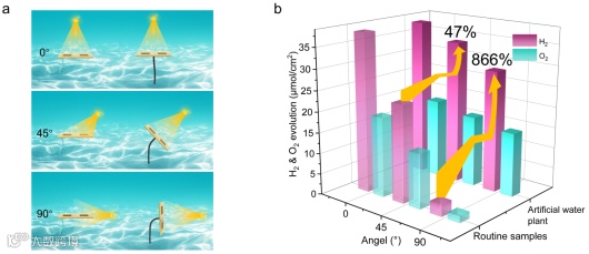 图5. 人工水草的集成结构创新设计,及在不同入射光角度(0°、45° 和 90°)下的水分解测试。(a)装置光响应功能的示意图,包含与对照样品的对比。(b) 装置与对照样品的氢气(粉色)和氧气(蓝色)产生速率比较。在45° 和 90°入射光下,此PEC体系的燃料生产效率分别提高了47%和866%。