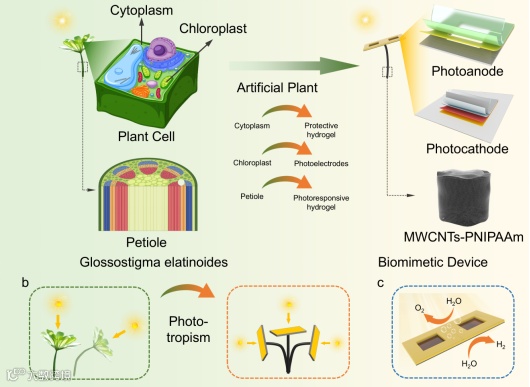 图 1. 基于PEC的向光性柔性轻质人工水草的创新设计与集成结构示意图。(a) 自然和仿生系统的结构。在自然植物中,细胞质保护叶绿体,叶柄为叶片提供结构支撑并促进其弯曲。在仿生设计中,水凝胶保护层模拟细胞质,保护光电极。光阳极和光阴极实现人工光合作用。此外,设计了光响应水凝胶叶柄以模拟向光性,为仿生叶片提供方向性弯曲和支撑。(b) 自然和仿生系统的向光行为。(c) 无偏压人工光合作用用于完全水分解的示意图。