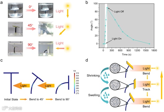 图4. 光响应仿生叶柄。(a)仿生叶柄在水中0°、45°和90°光照角度下的响应照片,(b) 光响应行为的定量分析,(c) 基于有限元分析的向光过程模拟,(d) 内部负反馈回路下的自我约束响应机制示意图。