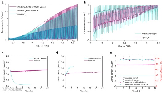 图3. 三电极体系下轻质仿生叶片的PEC性能。(a)光阳极,(b)光阴极,(c)光阳极稳定性,(d)光阴极稳定性,(e)法拉第效率。