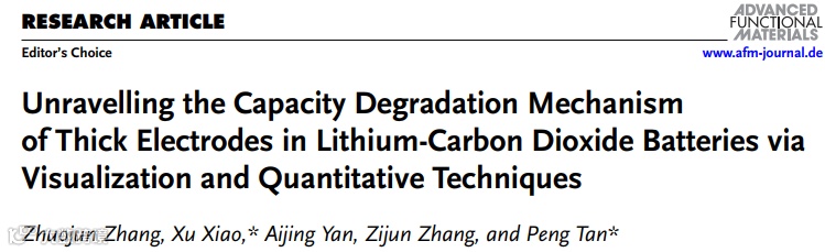 锂二氧化碳电池因其极高的理论能量密度而具有巨大的发展潜力。厚电极是实现高面能量密度(Wh cm-2)的最直接方式。然而,Li2CO3作为固体放电产物,一方面会堵塞电极孔隙,阻碍二氧化碳和锂离子在多孔电极中的扩散;另一方面会钝化电极表面,导致电子转移受阻。因此,亟需揭示锂二氧化碳电池厚电极容量衰减的根本原因。受限于现有的可视化技术,目前对于揭示多孔厚电极内部微观现象和定量理解电化学-传质耦合过程还存在挑战。