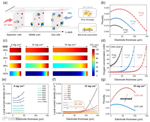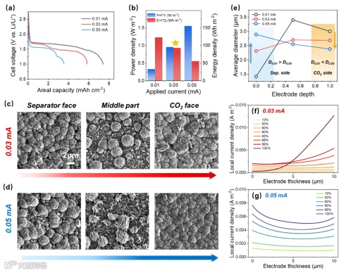 进一步建立了锂-二氧化碳电池电场与浓度场耦合模型,通过模拟仿真提升对厚电极关键因素的定量认识。图4显示在90-100%放电深度时,CO2浓度急剧下降,这是由于放电结束时进气口严重堵塞所致。因此,缓慢的气体扩散率和孔隙堵塞共同限制了厚电极的性能。有趣的是,随着电流密度的增加,Li2CO3的分布情况发生了逆转。当电流密度为0.05 mA时,隔膜侧形成的Li2CO3多于CO2侧。