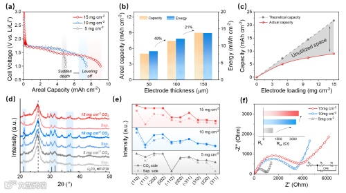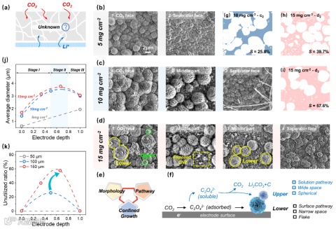 为了理解锂二氧化碳电池厚电极容量衰减机理,图2展示了电极厚度对电池放电性能的影响。多孔电极的利用率随着电极厚度增加而降低。随着电极厚度的增加,电子输运对电极失效的贡献减小,电极两侧Li2CO3产物结晶性差别增大。通过观察放电产物在厚度方向上的空间形态和分布,图3给出了Li2CO3的形貌结构、空间受限生长和反应途径之间的关系。Li2CO3的局部层状生长可能由生长空间决定。厚电极的未完全利用主要集中在中间部分,而不是在CO2和隔膜表面。随着电极厚度的增加,反应动力学差异直接决定了电极利用率和产物粒度分布的不均匀性。因此,在0.01 mA的电流下,CO2的输运动力学是决定因素。