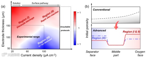结合实验和模拟结论,图6提供了不同工作条件下的失效机理热点图,为厚气体电极的设计提供了指导。红色区域(I)的电池故障主要归因于电极堵塞导致的二氧化碳极化。电流密度较大的红色区域(II)是由于快速电化学反应导致隔膜侧的二氧化碳浓度较低。蓝色区域(III)相对复杂,需要适度的消耗速率和扩散距离,在此期间,Li+离子起主导作用。传统设计中的单调孔隙梯度可能并非最佳选择,建议采用通用厚电极结构,以增加两侧储存固体产物的空间。因此,应进一步研究通过大孔促进沉积、增加局部比表面积以增强电化学反应、调节电解液浸润状态以及利用可溶性产物等方法提升电池的放电容量。