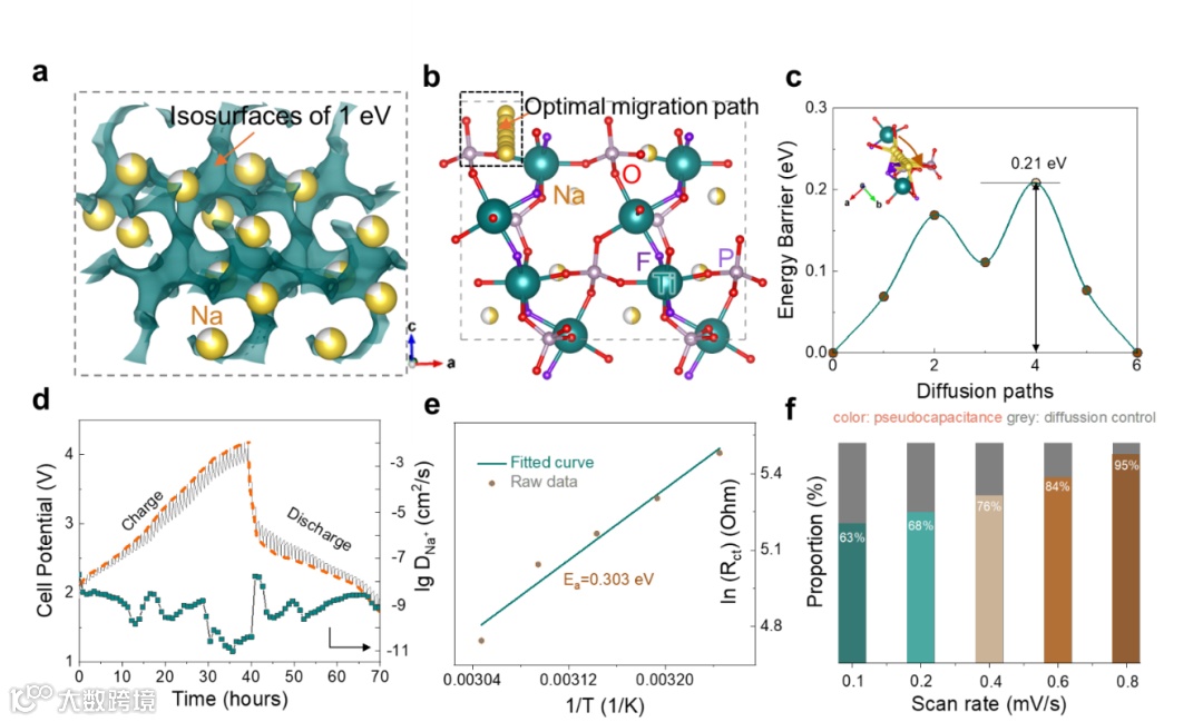 图5 理论计算和动力学行为;(a) 通过理论计算,等值面(设置为1eV水平)表示Na+离子的3D迁移路径。原始晶胞的晶体结构示意图,通过cNEB方法说明了最佳迁移途径(b)和相应的Na+迁移能量势垒(c);(d) GITT滴定曲线与NTPF电极在充电/放电过程中的扩散系数;(e) 反应NTPF电极离子电导率的活化能;(f) 不同扫描速率下的伪电容贡献百分比