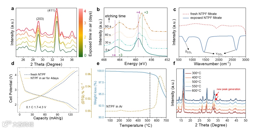 图6 NTPF材料的空气和热稳定性;(a) NTPF粉末在空气中暴露不同时间后的时间依赖性XRD图谱;(b) NTPF样品暴露于空气4天后的XPS深度分析;(c) 完全洗涤后新鲜空气和暴露空气NTPF样品滤液的FTIR光谱比较;(d) 0.1C下新鲜和暴露空气NTPF电极之间的典型充放电曲线;(e)新鲜NTPF样品在氩气中的TG分析;(f)Ar气氛下新鲜NTPF粉末的温度依赖性XRD图谱